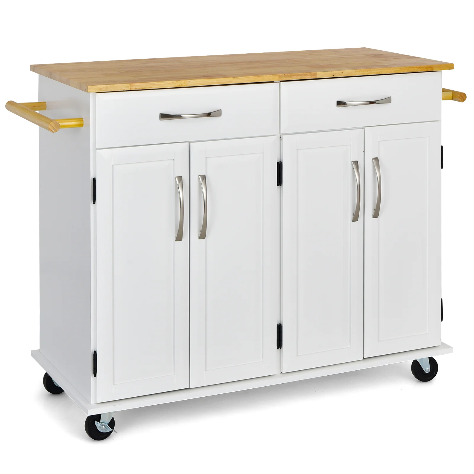The kitchen island table features a large rubber wood countertop, practical drawers, side racks and 2-door cabinet for the perfect storage solution.
